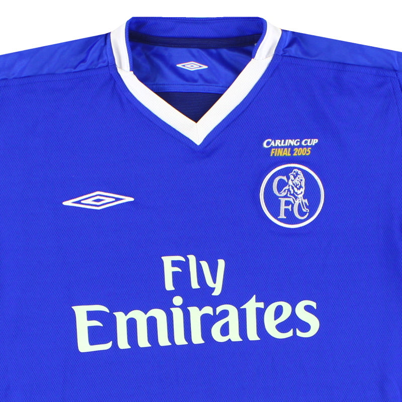 Home shirt as worn when Chelsea were competing in the 2005 Carling Cup Final on February 27, 2005, at the Millennium Stadium in Cardiff. Chelsea held on to win 3-2, securing their first trophy under José Mourinho.