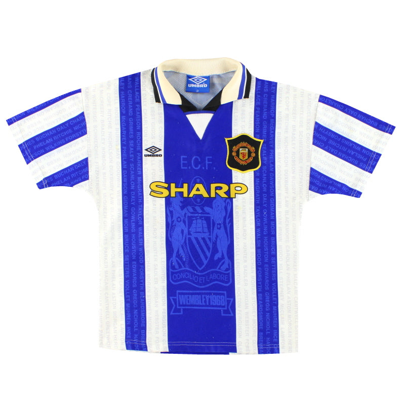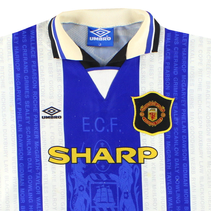 Third shirt as worn when Manchester United finished as runners up in the Premier League in the 1994-95 season before they won the title back in the next season, finishing 4 points ahead of second placed Newcastle United. Also worn when Manchester United won the FA Cup in the 1995-96 season beating arch rivals Liverpool when Eric Cantona scored a stunning volley five minutes from time. (Watermarked into the shirt is every player to have appeared for the club)