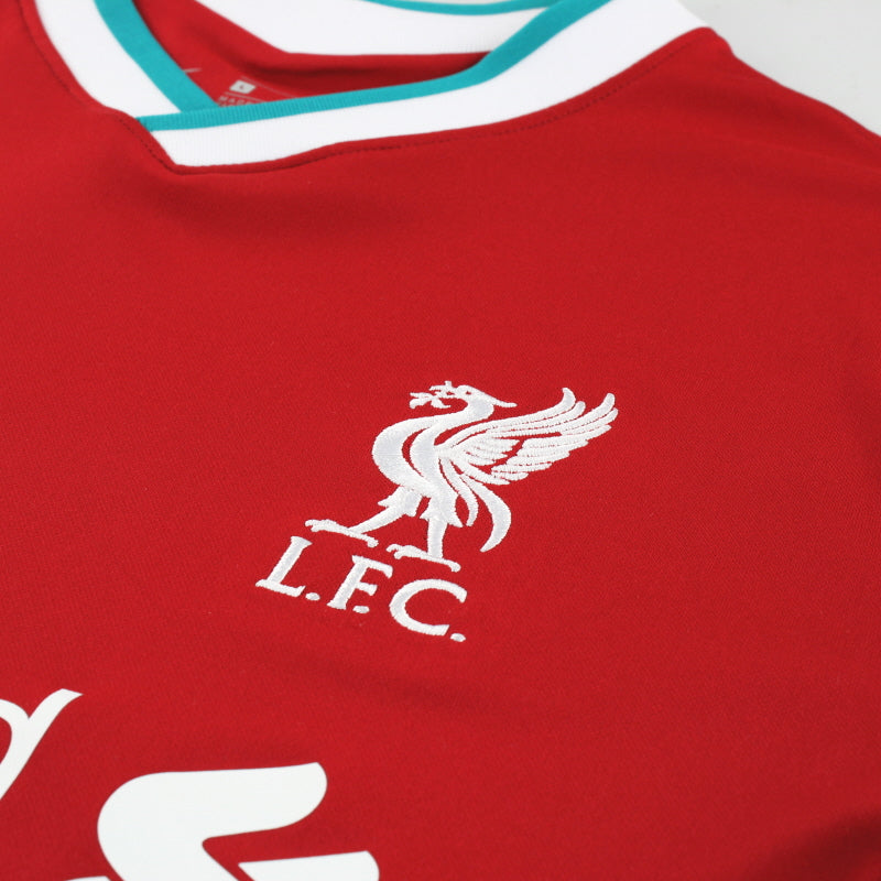 Home shirt as worn when Liverpool were looking to defend their Premier League title from the previous season. At the end of last season saw controversy as the American giants Nike outbid New Balance for a 5 year kit sponsorship , ending a 6 year stint for New Balance. The season started well for Liverpool with the team being top of the table, on 22 November 2020, they broke the club record for longest unbeaten run at home in the league (which had previously stood at 63) . At the the turn of the year, but the team suffered from a poor run of form in the middle of the season in a run that saw the team win only 3 out of 14 Premier League games and fall down the table and out of the European places. However, fortunes changed for Liverpool as the team managed to win 8 of their final 10 games ,which included goalkeeper Alisson scoring a stoppage-time winner against West Brom (the first goal ever scored by a Liverpool goalkeeper in the 129-year history of the club) and secure a 3rd place finish in the Premier League and Champions League football for the next season.