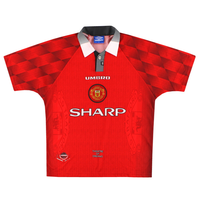 Home shirt as worn when Manchester United won the Premier League in the 1996-97 season before failing to defend their title in the next season, finishing 1 point off top spot. Also worn when Manchester United made it to the semi finals of the 1996-97 Champions League.