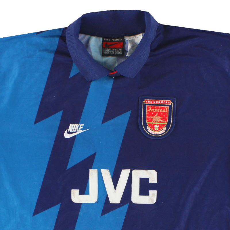 The 1995 Arsenal away shirt is one of the most iconic and polarizing kits in the club's history. Manufactured by Nike, it featured a bold navy blue base with an eye-catching blue lightning bolt pattern that dominated the design. The shirt was completed with a classic polo-style collar in navy with yellow trim, the Arsenal crest on the left chest, and the JVC sponsor logo in white across the front. Worn during the 1995-96 season, it marked a transitional period for the club under manager Bruce Rioch and the arrival of Dennis Bergkamp. While Arsenal finished 5th in the Premier League that season, the shirt itself has endured as a cult classic among fans, admired for its daring 1990s aesthetic and sought after by collectors of vintage football kits.