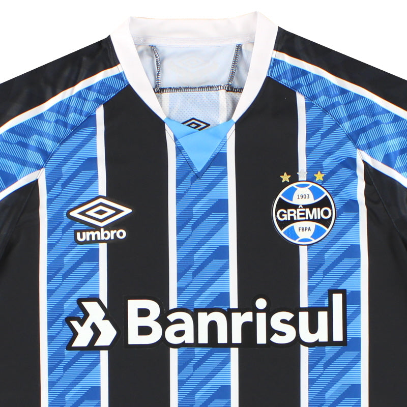 Away shirt that presents a fresh twist on the club's classic design—black and blue stripes divided by slim white lines, with a subtle geometric pattern embedded within the blue stripes.