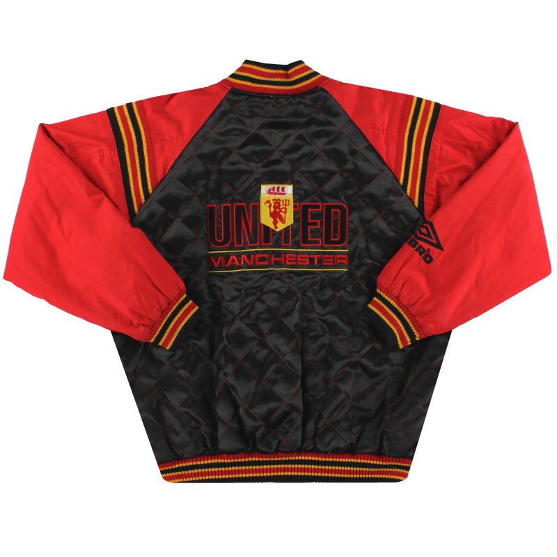 Details - Bomber jacket as worn when Manchester United were crowned champions in the inaugural Premier League season, finishing 10 points ahead of second placed Aston Villa, and were knocked out in the fifth round of the FA Cup, losing 2-1 against Sheffield United. Also worn when Manchester United were knocked out in the first round of the UEFA Cup, losing 4-3 on penalties against Torpedo Moscow after the tie finished 0-0 on aggregate.