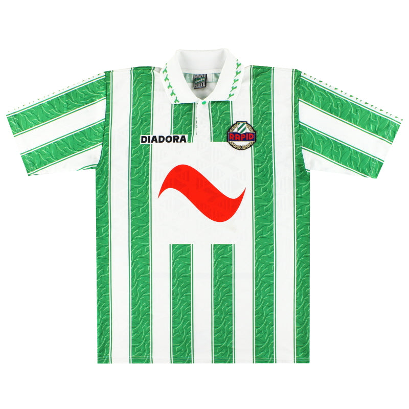 The 1994-95 Rapid Vienna home shirt, produced by Diadora, is a bold and eye-catching design that perfectly captures the vibrant aesthetic of mid-1990s football kits. The shirt features the club's traditional green and white vertical stripes, but with a distinctive twist—a zigzag pattern running through the stripes, giving it a dynamic, modern look for the era.