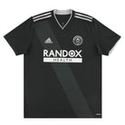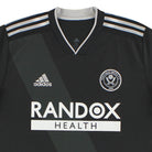 Away shirt showcases a striking design with a bold grey diagonal stripe sweeping across the chest, complemented by silver Adidas branding and the club crest. Worn in the season when The Blades secured a respectable fifth-place finish in the Championship,