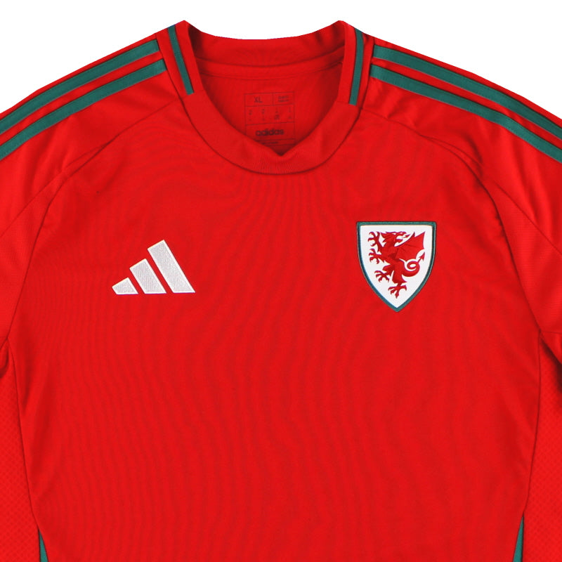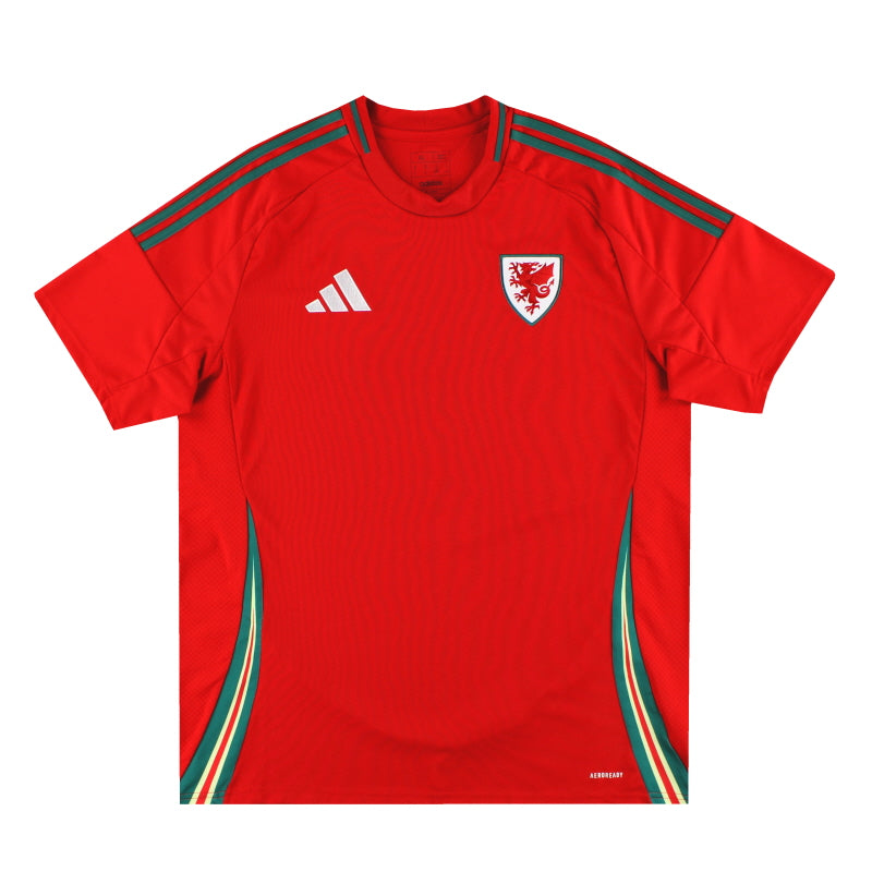 Home shirt presents a sharp, symbolic design rooted in Welsh heritage. Bathed in a bold Better Scarlet red, the shirt features dark green adidas shoulder stripes and lower stripes give a nod to the 76 era.