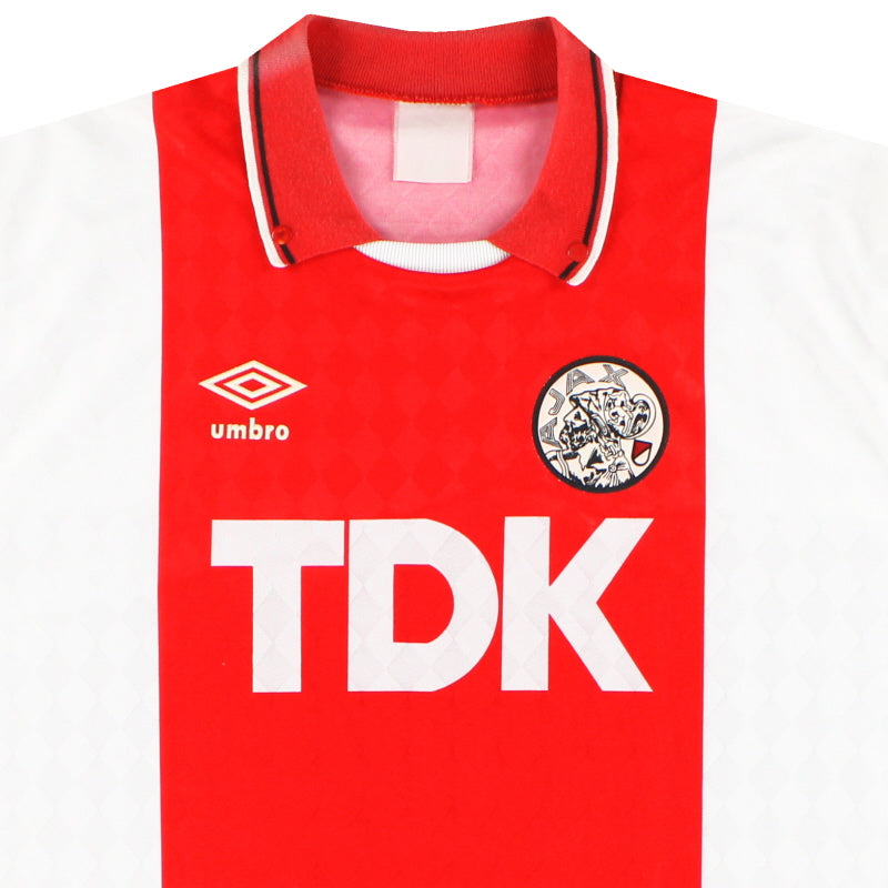 Home shirt as worn when Ajax finished 1st and 2nd in the Eredivisie in respective seasons, finishing 1 point ahead of second placed PSV Eindhoven in the 1989-90 season. Also worn when Ajax were knocked out in the first round of the 1989-90 UEFA Cup, losing 4-0 on aggregate against Austria Wien.