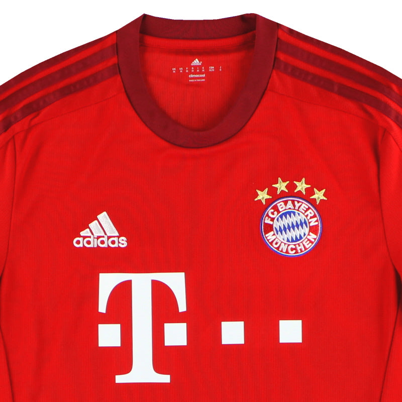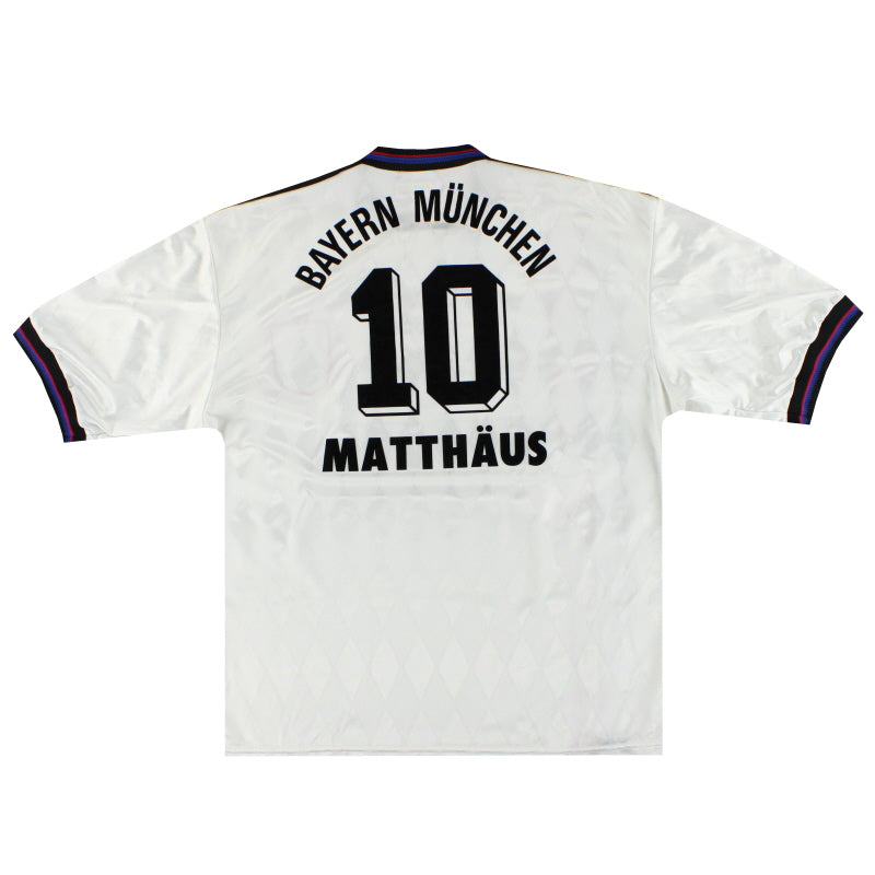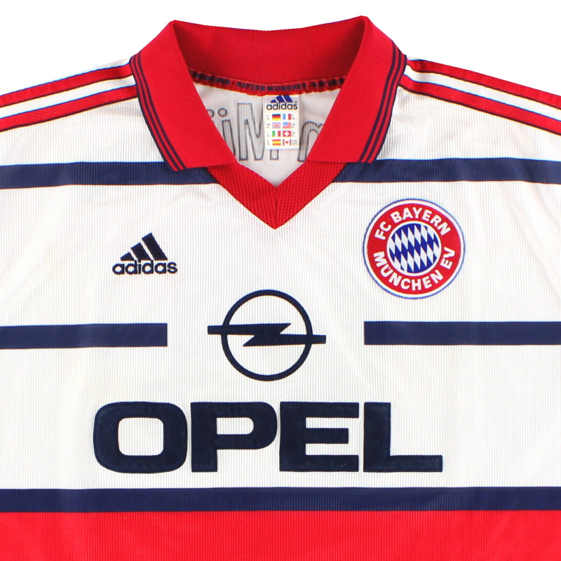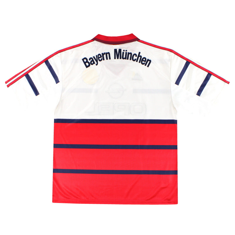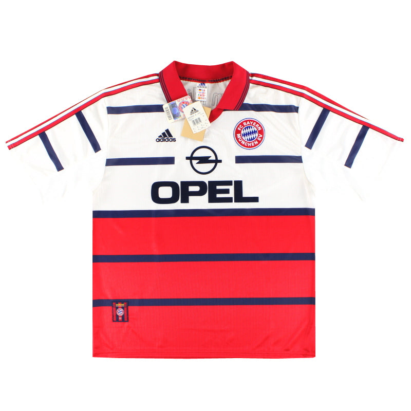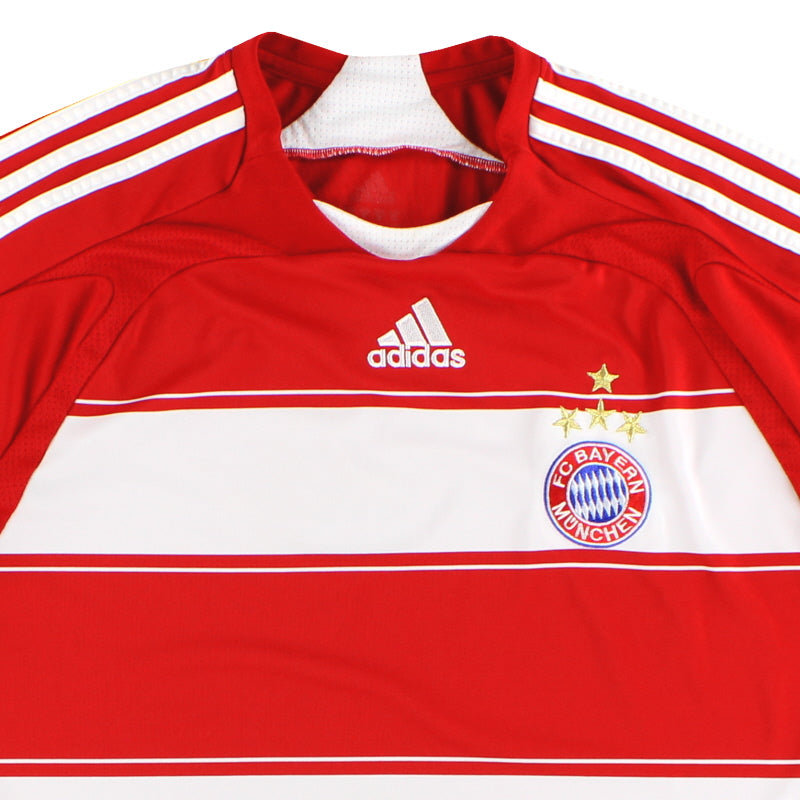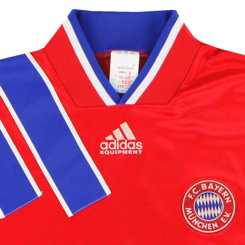 Being a Bayern Munich shirt collector must require a lot of storage space as the German giants have worn an incredible number of kits in the past 30 or so years. Red of course is the favoured home colour (although originally white shirts were worn with red only arriving in 1905 when the side joined forces with Munchner Sport-Club who insisted on changing the jersey colour) and on more than one occasion the side have worn several different designs of home kit in the same season. Bayern are also one of the leading pioneers of adopting a completely different kit for Champions League and Cup games - often in a totally different colour. Although white has always been used to trim the Bayern shirt in the early 90s blue also began to creep in as an additional trim colour culminating in the Barcelona-like 1995 striped jersey. More recently red and white hoops or stripes have also been sported. The Bayern shirt is also renowned amongst football kit afficiandos for having the club name printed on the back of the shirt - probably something to do with the fact that in recent years a badge didn't appear regularly on the front of the jersey until 1989! White shirts are the most traditional Bayern change outfits although in the 80s and 90s the club had an unusual tradition of wearing yellow and green for luck when playing their rivals FC Kaiserslautern. The club have stayed loyal to local suppliers when it comes to kit and have been with adidas since the early 1970s. In fact for several years adidas also acted as shirt sponsor for the side before being replaced by Magirus Deutz in 1979. Iveco, Commodore and Opel have subsequently sponsored the team with mobile phone company T-Mobile arriving in 2002.