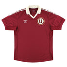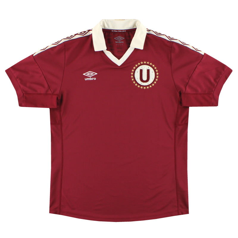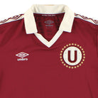 The burgundy Universitario 2014 90th Anniversary Kit showcases a classic team crest, surrounded by 26 stars symbolising the club’s 26 championship titles. Gold accents highlight the brilliance of each victory, celebrated by both players and fans. Designed by Umbro, the kit features a traditional cream collar with the inscription “90 años, 1924–2014.” Beneath it are the years of Universitario’s title wins. The Double Diamond logo is displayed along the sleeves, while a special 90th-anniversary emblem appears on the back of the neckline.