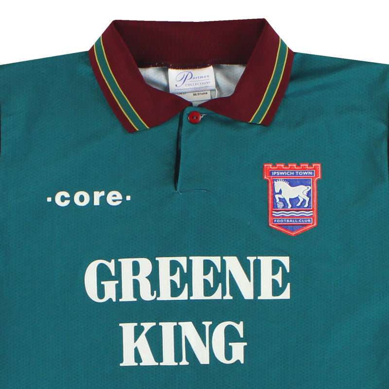 Away shirt as worn when Ipswich finished 7th in the First Division, finishing 2 points off a play off place, and were knocked out in the fifth round of the FA Cup, losing 3-1 against Aston Villa. Also worn when Ipswich were knocked out in the second round of the League Cup, losing 3-2 on aggregate against Stockport County.
