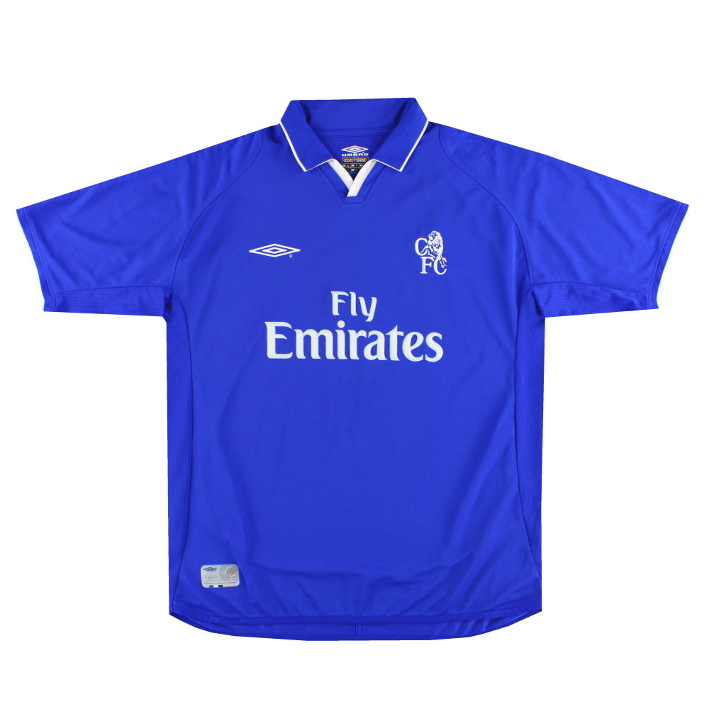 Home shirt as worn over two seasons. The first saw Claudio Ranieri take charge of his first full season as manager which saw him lead the club to a 6th place finish for the second season running. The following season saw the side finish 4th in the Premier League and qualify for the Champions League. Also worn in the 2002 FA Cup final where Chelsea lost 2-0 against Arsenal with goals from Ray Parlour and Freddie Ljungberg.