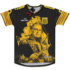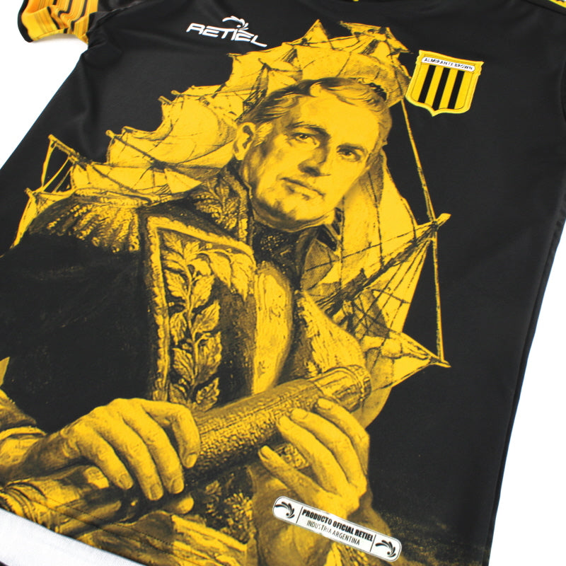 Fourth shirt released by Club Almirante Brown to honour the 164th anniversary of the death of Admiral William 'Guillermo' Brown. The Irish born National hero, who the club is named after, was Argentina's first admiral and is often referrred to as the 'Father of the Argentine Navy'. The shirt features a sketch of William 'Guillermo' Brown on the front and another sketch of a ship on the back. Its colors were taken from an old English locomotive called “Rocket”, famous for winning a competition in the UK organized in 1829 by the Liverpool to Manchester Railway