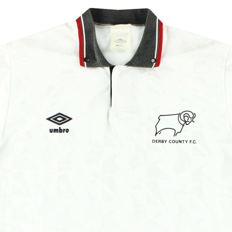 Details - Home shirt as worn when Derby County finished 3rd in the Second Division in the 1991-92 season, failing to gain promotion to the Premier League after losing 5-4 on aggregate against Blackburn Rovers in the play off semi finals. Also worn when Derby County finished 8th in the newly formed First Division in the 1992-93 season and were knocked out in the quarter finals of the 1992-93 FA Cup, losing 1-0 against Sheffield Wednesday in a replay.