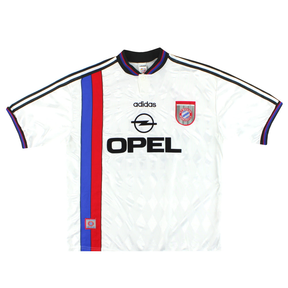Away shirt as worn when Bayern Munich finished as champions in the Bundesliga in the 1996-97 season. Also worn in the 1996 UEFA Cup final when Bayern Munich won 5-1 on aggregate.