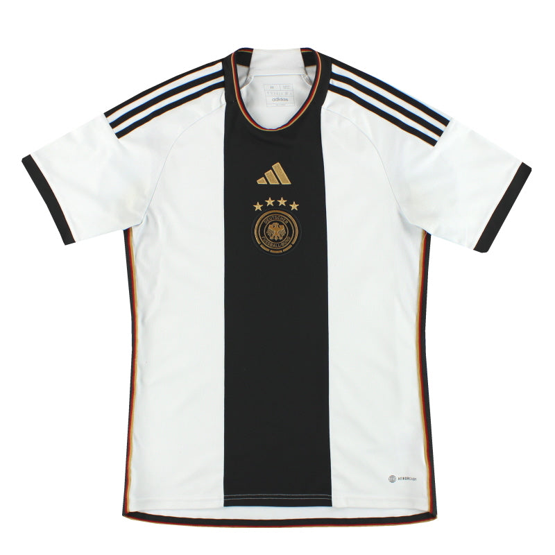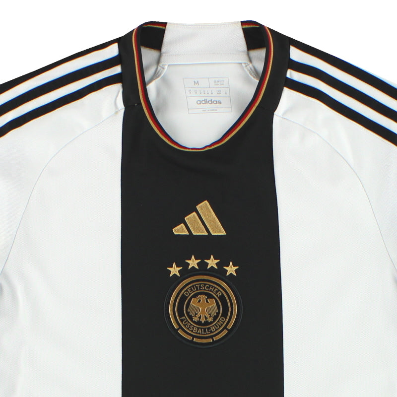 The Germany 2022 home jersey, designed for the World Cup in Qatar, features a white base with black and metallic gold accents. The official name of the gold shade is "Tactile Gold Metallic," which has a metallic finish. A striking black vertical stripe runs down the centre of the shirt, reminiscent of the EURO 2008 away kit. This design element takes inspiration from racing stripes seen on racing cars. As with many past Germany home kits, the national flag is subtly incorporated. It appears on the collar and as a stripe extending from the sides to the bottom hem.