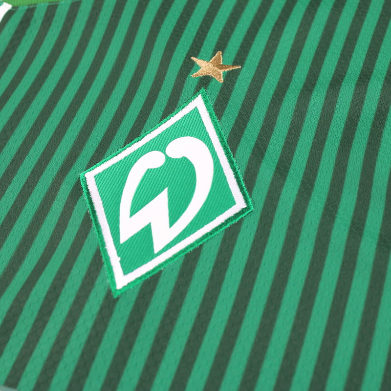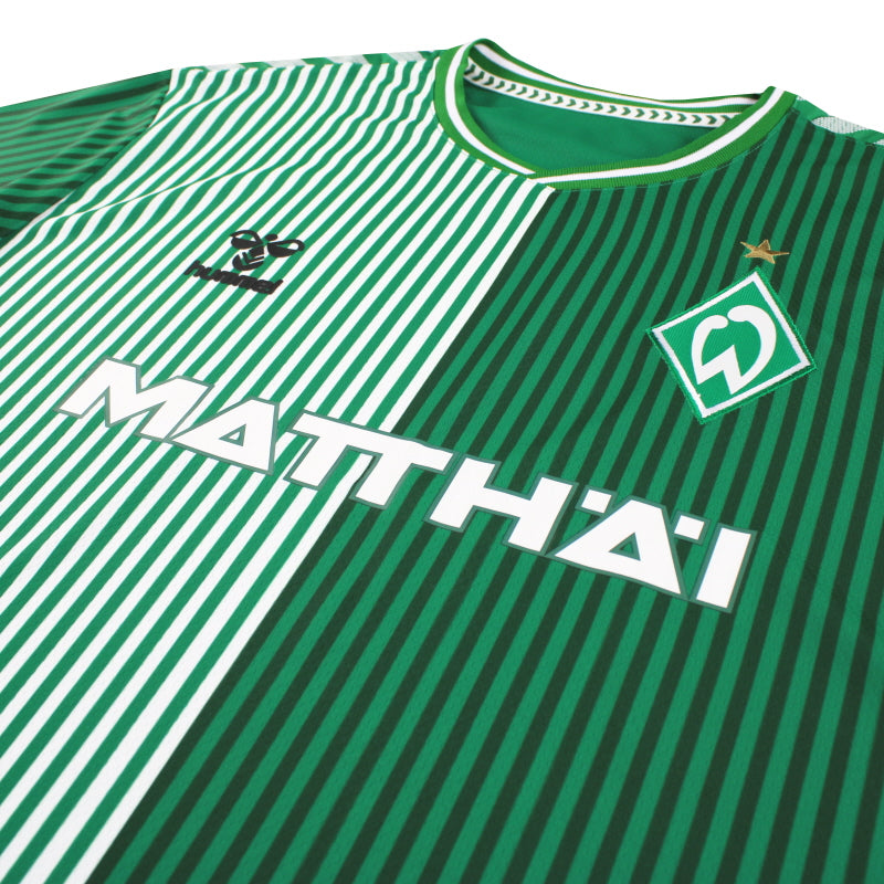 Details - The Werder Bremen 23/24 home shirt is inspired by the iconic design of the Danish national team shirt from 1986, as a nod to both hummel's 100-year anniversary and the longstanding connection between the club and hummel. It features a combination of tonal green and white hues with a vertical stripe pattern, complemented by green and white chevrons on the shoulders. The jersey includes a ribbed V-neck and mesh panels on the shoulders for enhanced airflow. Displayed on the chest are the hummel logo and a woven Werder Bremen club logo badge, accompanied by a gold star embroidered above. Additionally, the club's motto, LEBENSLANG GRÜN – WEISS (meaning Lifelong Green and White), is printed on the back of the neck.