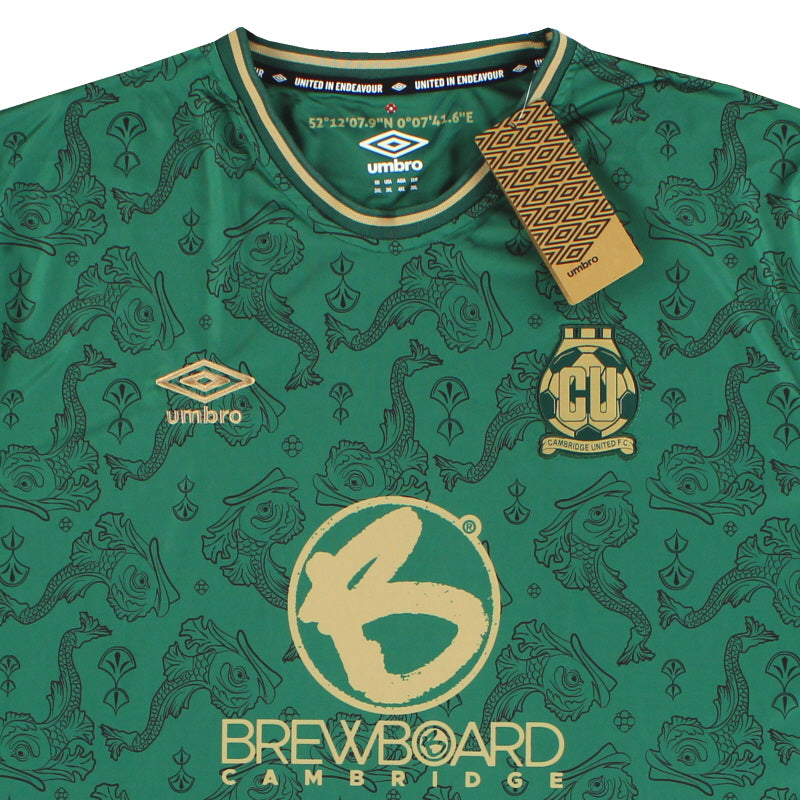 The striking moss green third shirt boasts an all over sublimated design, featuring heraldic dolphins intertwined with floral and leaf motifs inspired by one of the city’s most distinctive landmarks. This shirt draws inspiration from a long-standing fixture of Parker’s Piece the birthplace of modern football rules and the city’s first electric lamp post, the iconic Reality Checkpoint.