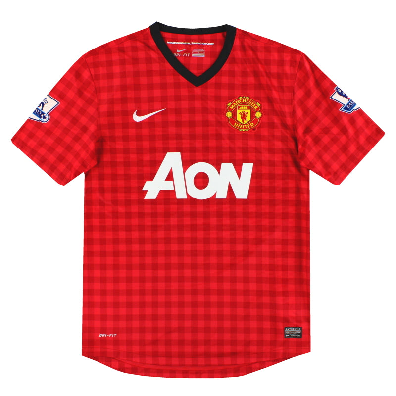 Home shirt as worn in Sir Alex Ferguson's final season in charge of Manchester United before retirement. Manchester United won the Premier League title for the 20th time after a Robin van Persie hat trick against Aston Villa clinched it with 4 games still to play.