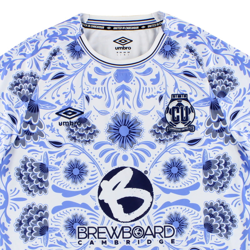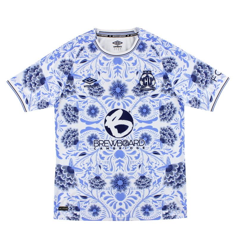 The vibrant blue and white away shirt takes its initial inspiration from the abundance of water lilies along the River Cam, evolving into a bold, aqua themed floral baroque design reminiscent of patterns found in Far Eastern pottery.