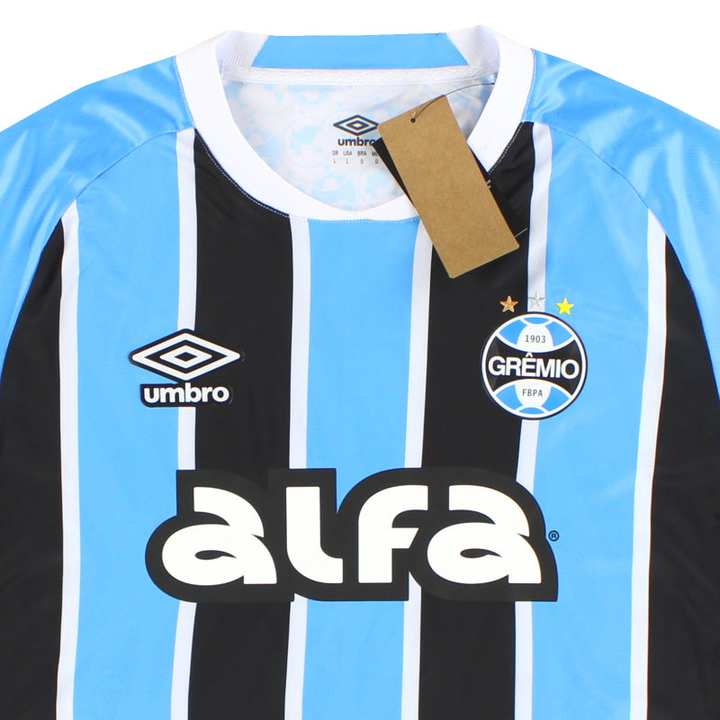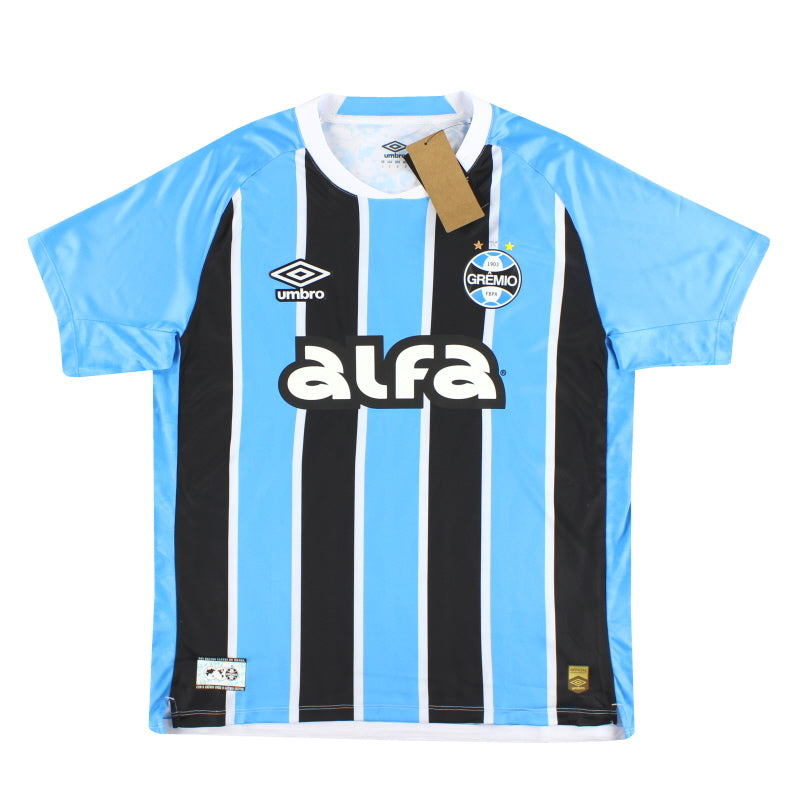 The Umbro Grêmio 2025 shirt features the classic vertical stripes in sky blue and black, divided by clean white lines that define its iconic look. A unique white V-neck collar is adorned with subtle graphic details, and the word "Immortal" appears on the back of the neck, positioned above the flag of Rio Grande do Sul.