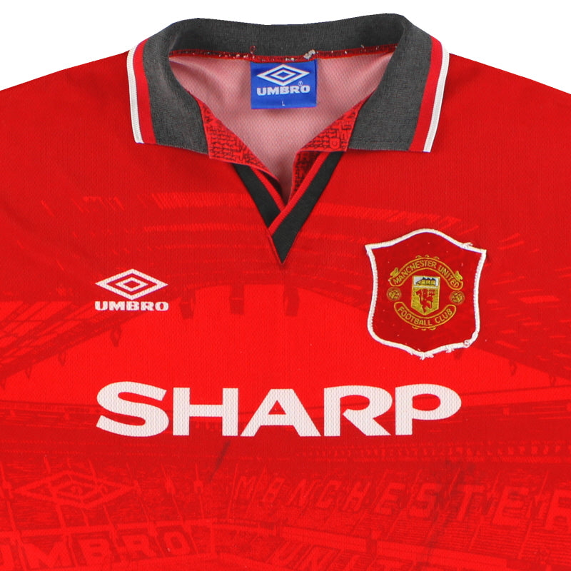 Classic home shirt with the stadium printed in the background, as worn when Manchester United finished as runners up in the Premier League in the 1994-95 season before they won the title back in the next season, finishing 4 points ahead of second place.