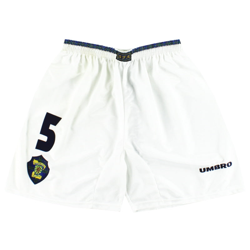 Details - Home shorts belived to be issued or worn by #5 (Colin Hendry) when Scotland were knocked out in the group stages of the 1998 World Cup, finishing bottom of their group with just 1 point from their three games.