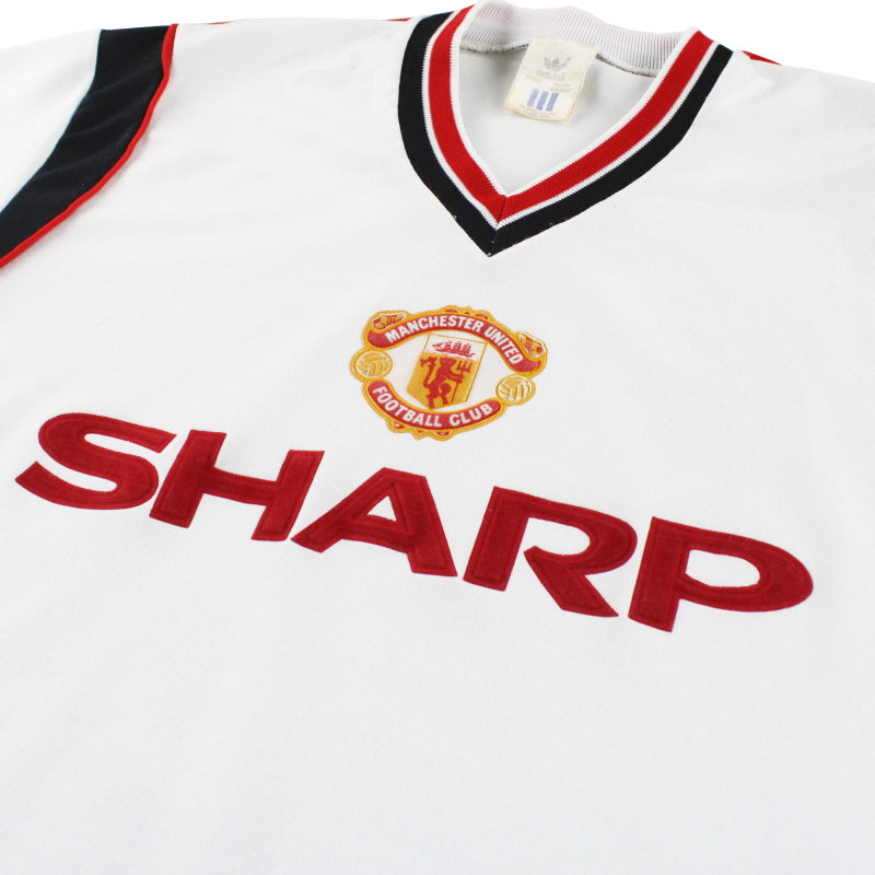 Details - Extremely rare vintage away shirt as worn when Manchester United finished 4th in both seasons in the First Division and won the 1985 FA Cup final, beating Everton 1-0 with Norman Whiteside scoring the winning goal in extra time. Also worn when Manchester Untied were knocked out in the quarter finals of the 1984-85 UEFA Cup, losing 5-4 on penalties against Videoton.