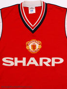 Details - Extremely rare vintage home shirt as worn when Manchester United finished 4th in both seasons in the First Division and won the 1985 FA Cup final, beating Everton 1-0 with Norman Whiteside scoring the winning goal in extra time after Kevin Moran was sent off for Manchester United in the 78th minute.