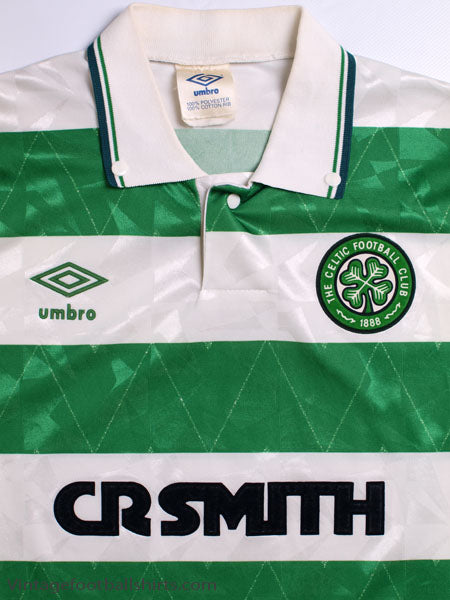 Details - Home shirt as worn when Celtic finished 5th and 3rd respectively in the Scottish Premier Division and made it to the final of both the 1989-90 Scottish Cup and the 1990-91 Scottish League Cup, losing 9-8 on penalties against Aberdeen in the 1989-90 Scottish Cup final and lost 2-1 against Rangers in the 1990-91 Scottish League Cup final. Also worn when Celtic were knocked out in the first round of the UEFA Cup Winners' Cup, being knocked out on away goals against FK Partizan after the tie finished 6-6 on aggregate.