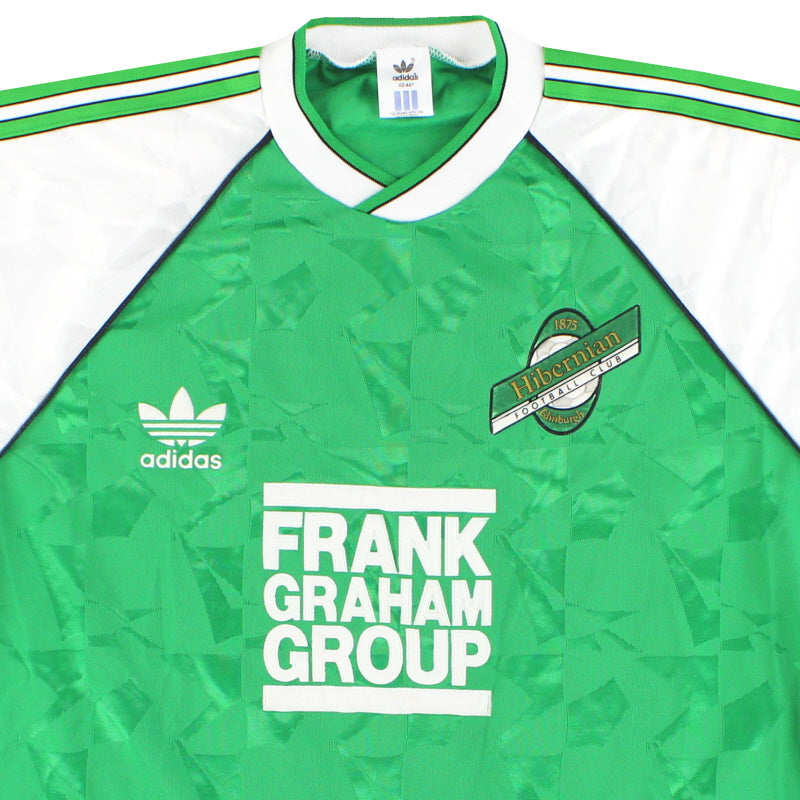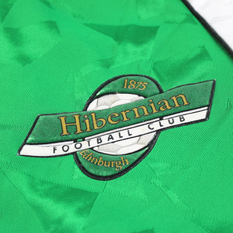Details - Home shirt as worn when Hibernian finished 7th and 9th respectively in the Scottish Premier Division and were knocked out in the quarter finals of the 1989-90 Scottish Cup, losing 1-0 against Dundee United. Also worn when Hibernian were knocked out in the second round of the UEFA Cup, losing 1-0 on aggregate against RFC Liege.