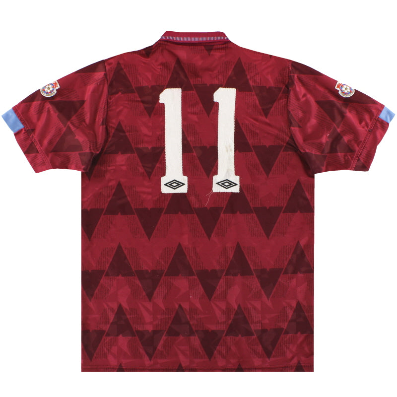 Details - Match issue away shirt believed to have been worn by or issued to #11 of Manchester City when the team finished 5th in the First Division in back to back seasons under player manager Peter Reid after he took over from Howard Kendall in November 1990. In total eight different combinations were worn by the club, including three different types of shorts with the home kit and and a third shirt that had three outings with different shorts and socks in each instance.This maroon away shirt was intended purley to stop clashing of shirts, though, unusually it was used at home to Tottenham Hotspur in December, the foggy weather raised concerns about visibility and clashing with Spurs. For the first time, Football League sleeve patches were added.