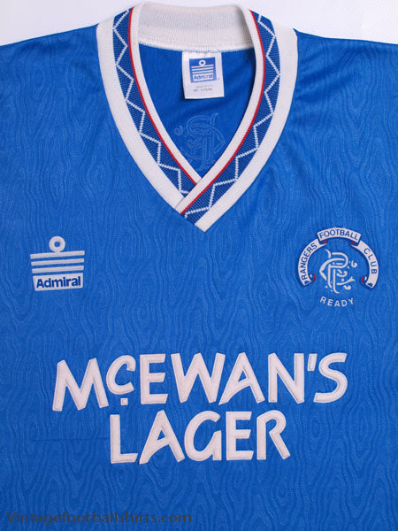 Details - Vintage Admiral home shirt as worn when Rangers won back to back Scottish Premier Division and were knocked out in the second round of the 1990-91 European Cup, losing 4-1 on aggregate against Red Star Belgrade. Also worn when Rangers won the 1990-91 Scottish League Cup, beating Celtic 2-1 in the final, and won the 1991-92 Scottish Cup, beating Airdrie 2-1 in the final.