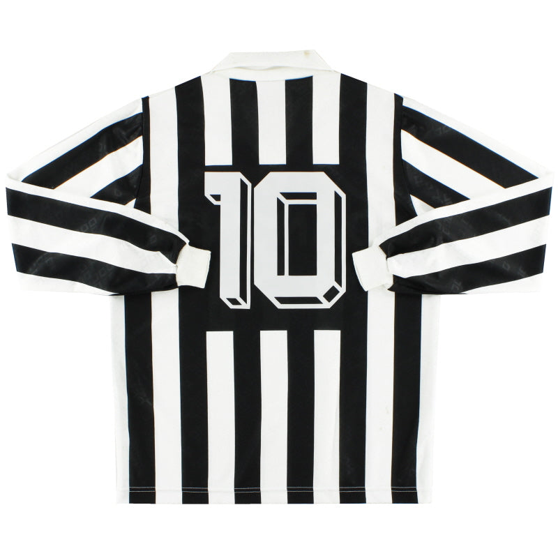 Details - Home shirt as worn when Giovanni Trapattoni led Juventus to 4th and 2nd place finishes in Serie A in respective seasons and also led Juventus to UEFA Cup triumph in the 1992-93 season, beating Borussia Dortmund 6-1 on aggregate in the final. The 1993-94 season was also Giovanni Trapattoni's last season as Juventus manager in a trophyless season that saw the team fail to defend their UEFA Cup title, being knocked out in the quarter finals of the competition.