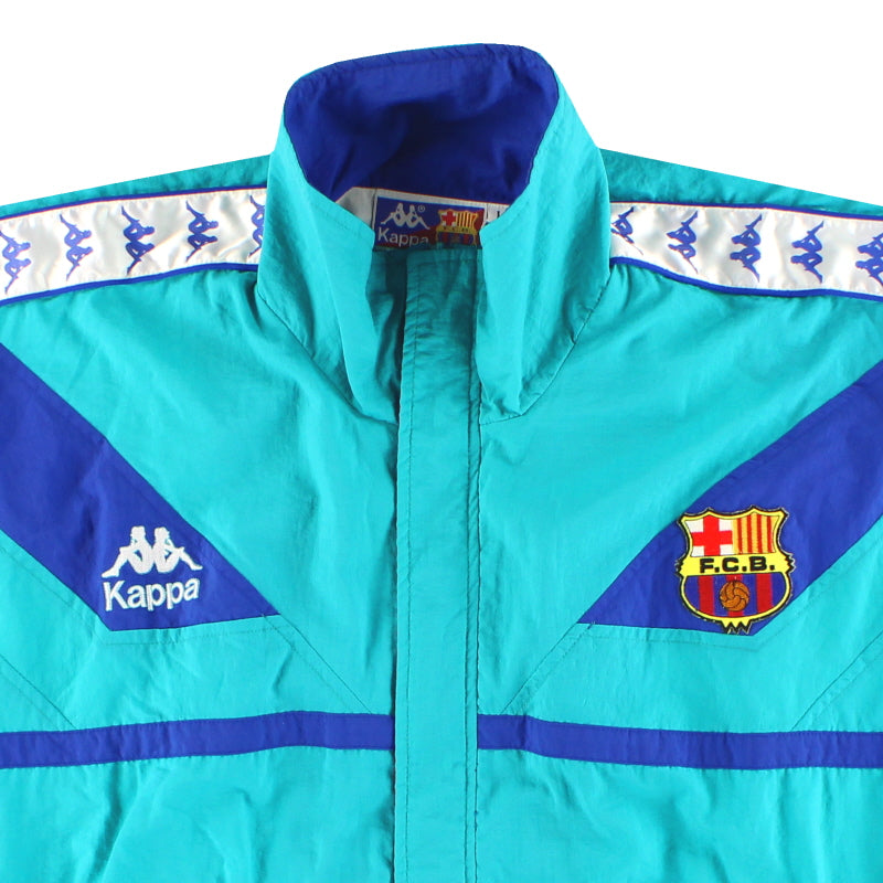Track jacket as worn when Barcelona won back to back La Liga titles in the 1992-93 and 1993-94 seasons, and were knocked out in the semi finals of the 1992-93 Copa del Rey, losing 3-2 on aggregate against Real Madrid. Also worn when Barcelona made it to the final of the 1993-94 Champions League, losing 4-0 against AC Milan.