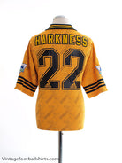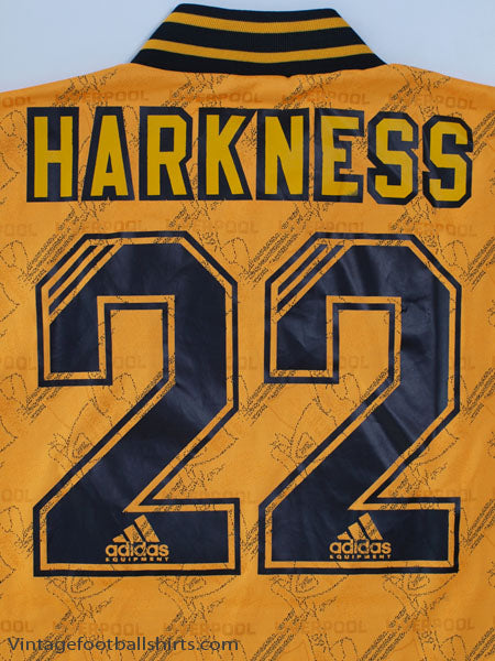 Details - Third shirt believed to have been worn by or issued to Steve Harkness during the 1993-94 season. Harkness joined Liverpool from Carlisle United in 1989 for £75,000. During his time at the club Harkness made 139 appearances for Liverpool, scoring 3 goals, in a spell that included loan spells to Huddersfield and Southend before moving on permanently in 1999, joining former manager Graeme Souness at Benfica. After his short spell in Portugal, Harness went on to play for Blackburn Rovers and Sheffield Wednesday before being forced to retire at the age of 31 while playing for Chester City. The shirt itself was introduced for boxing day in 1993 after the club were informed of a kit clash with their usual change shirt of green and white and Sheffield United's red and white.