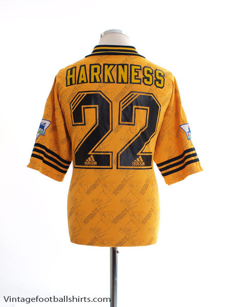 Player Features - Harkness #22 to reverse in correct size and style plastic print, Premier League patches to both sleeves, no registered mark to adidas logo, club crest has white flames coming from white torches only on the 1993-94 design, fabric has 'Liverpool' watermarked throughout design