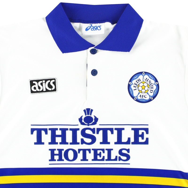 Details - Home shirt as worn when Leeds United finished 5th in the Premier League in consecutive seasons under Howard Wilkinson and were knocked out in the fifth round of the 1994-95 FA Cup, losing 3-1 against Manchester United.