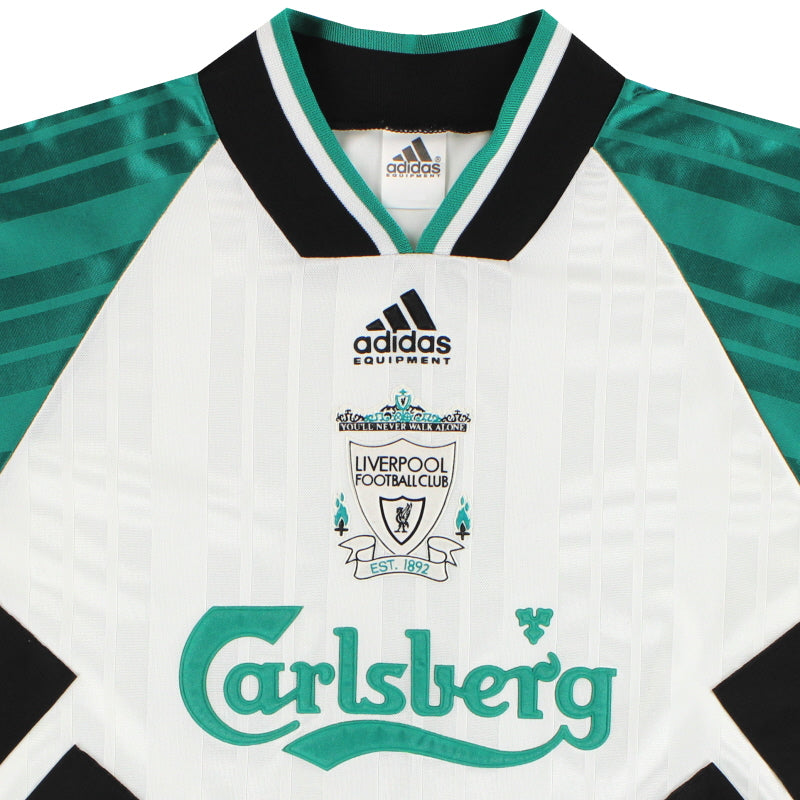 Details - Classic away shirt as worn when Roy Evans took over from Graeme Souness, finishing 8th and 4th respectively in the Premier League and also won the 1995 League Cup final, beating Bolton Wanderers 2-1 with Steve McManaman scoring a brace before Alan Thompson scored a consolation goal for Bolton.
