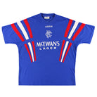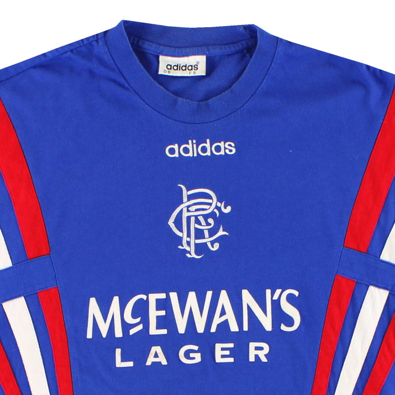 Leisure tee as worn during a season when Rangers claimed the Scottish Premier Division title, finishing 15 points clear at the top. The team was eliminated in the fourth round of the Scottish Cup following a 4-2 defeat and exited the Champions League in the qualifying round with a 3-0 aggregate loss.
