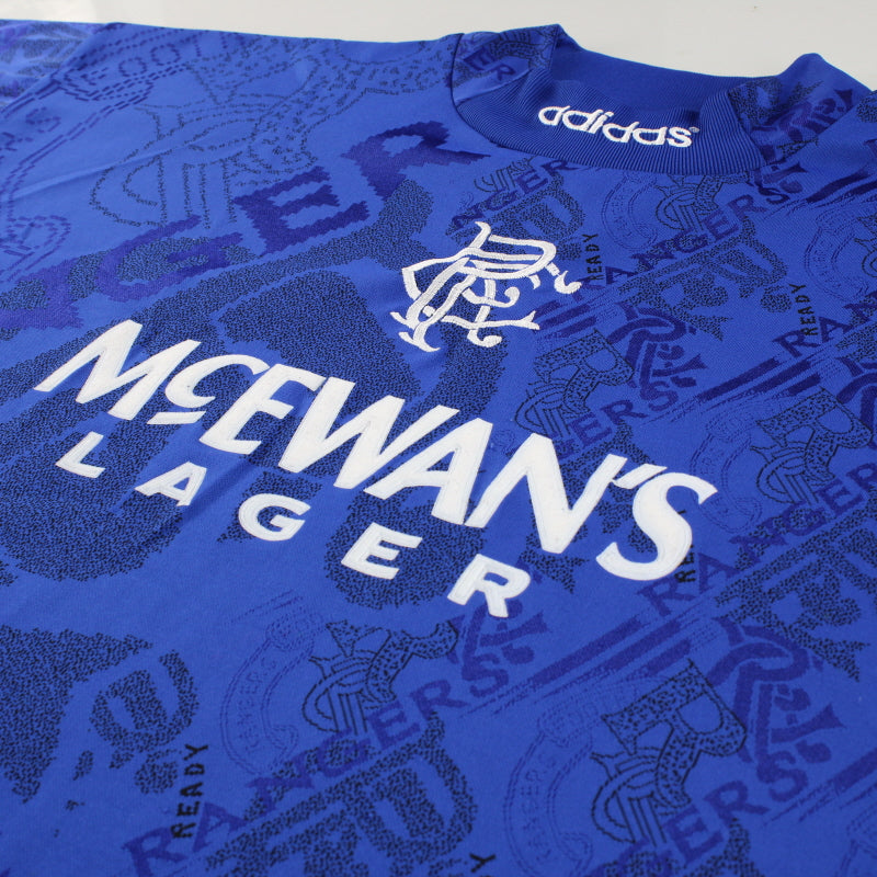 Details - Home shirt as worn when Rangers won the Scottish Premier League in back to back seasons and also won the 1995-96 Scottish Cup, beating Hearts 5-1 in the final. Also worn when Rangers were knocked out in the group stages of the 1995-96 Champions League, finsihing bottom of their group behind Juventus, Borussia Dortmund and Steaua Bucuresti.