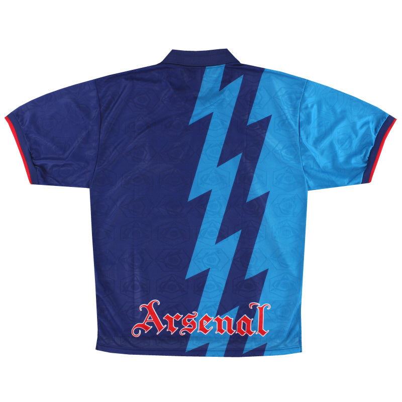 Away shirt as worn in Bruce Rioch's first and only season in charge with Arsenal finishing 5th in the Premier League and making it to the semi finals of the League Cup, being knocked out on away goals against Aston Villa.