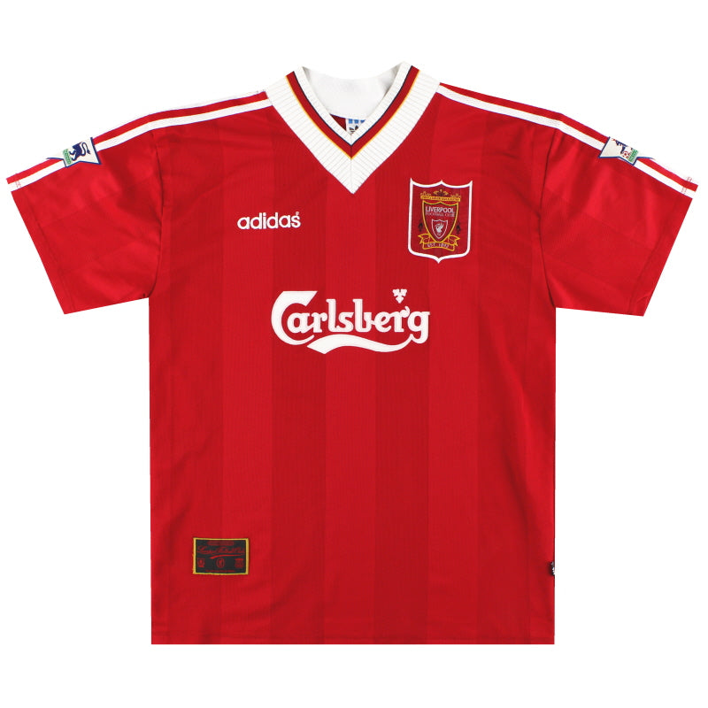 Details - Home shirt as worn when Liverpool finished 3rd in the Premiership under manager Roy Evans, and was worn in the epic game against Newcastle at Anfield ending in a 4-3 victory. Also worn when Liverpool made it to the final of the FA Cup, losing 1-0 against Manchester United with Eric Cantona scoring the winner in the 85th minute.