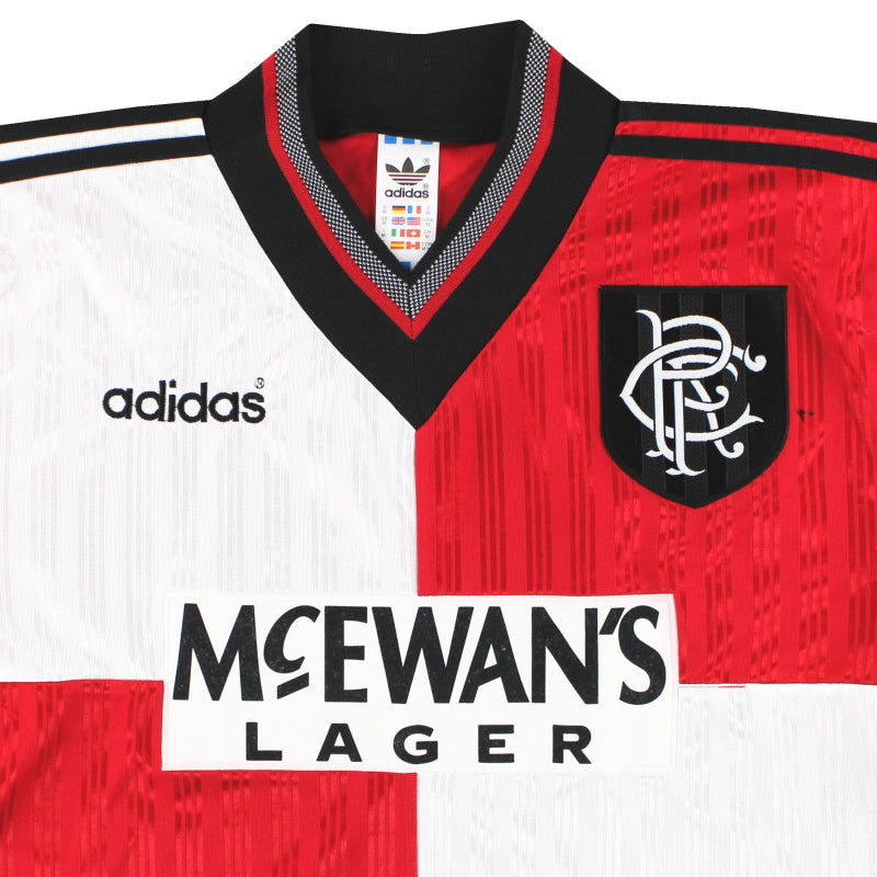 Details - Away shirt as worn when Rangers won the Scottish Premier Division for the 8th consecutive season, finishing 4 points ahead of second placed Celtic, and also won the Scottish Cup, beating Hearts 5-1 in the final. Also worn when Rangers were knocked out in the group stage of the Champions League, finishing bottom of their group behind Juventus, Borussia Dortmund and Steaua Bucharest.