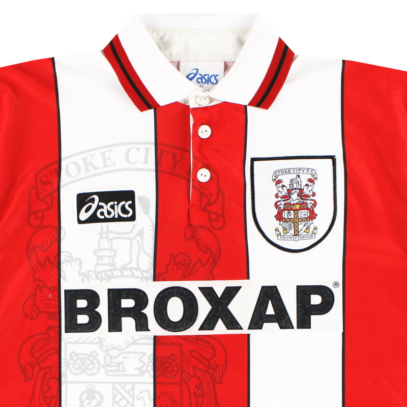 Details - Home shirt as worn when Stoke City finished 4th in the First Division, failing to gain promotion to the Premier League after losing 1-0 on aggregate against Leicester City in the play off semi finals. Also worn when Stoke were knocked out in the third round of both the FA and League Cup, losing against Nottingham Forest and Leicester City in respective competitions.