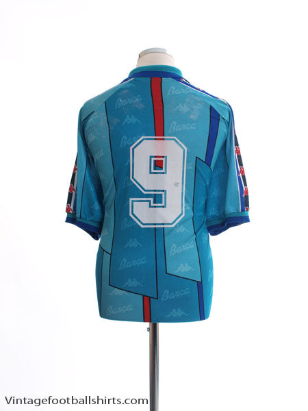 Details - Away shirt as worn when Barcelona finished 3rd and 2nd respectively in La Liga and made it to back to back Copa del Rey finals, losing 1-0 after extra time against Atletico Madrid in the 1995-96 season before beating Real Betis 3-2 after extra time in the 1996-97 season. Also worn when Barcelona won the 1996-97 UEFA Cup Winners' Cup, losing 1-0 against Paris Saint-Germain.