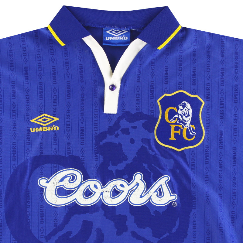 Details - Home shirt as worn when Chelsea finished 11th in the Premier League in the 1995-96 season and also made it to the semi finals of the 1995-96 FA Cup before player-manager Glenn Hoddle left the club to take the England job at the end of the season. In the next season Ruud Gullit took over as player-manager, improving on the previous season, leading the club to a 6th place finish in the Premier League and also won the FA Cup, beating Middlesbrough 2-0 in the final.