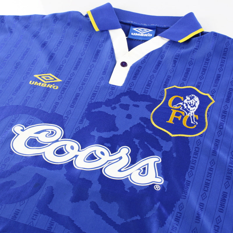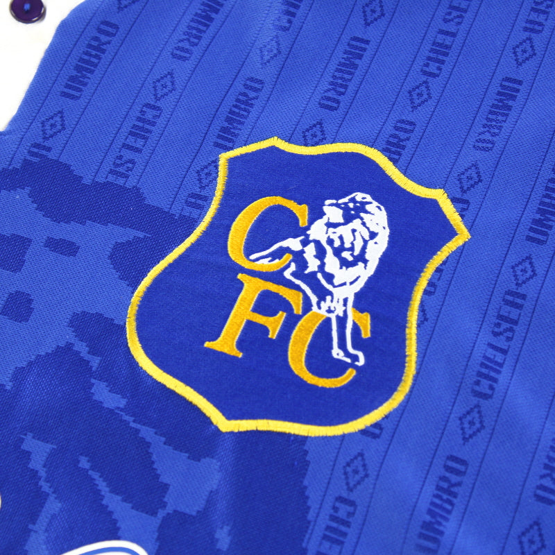Details - Home shirt as worn when Chelsea finished 11th in the Premier League in the 1995-96 season and also made it to the semi finals of the 1995-96 FA Cup before player-manager Glenn Hoddle left the club to take the England job at the end of the season. In the next season Ruud Gullit took over as player-manager, improving on the previous season, leading the club to a 6th place finish in the Premier League and also won the FA Cup, beating Middlesbrough 2-0 in the final.