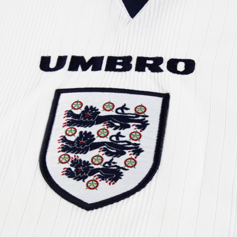 Details - Classic home shirt as worn in the 2-0 win over Scotland in Euro 1996, where Gazza scored a superb goal, lifting it over Colin Hendry's head with his left foot and then waited for it to drop before volleying past Andy Goram with his right, The celebration is equally memorable, as Gazza and teammates recreated the infamous 'dentists chair' drinking photo that had been plastered all over the tabloids before the tournament.