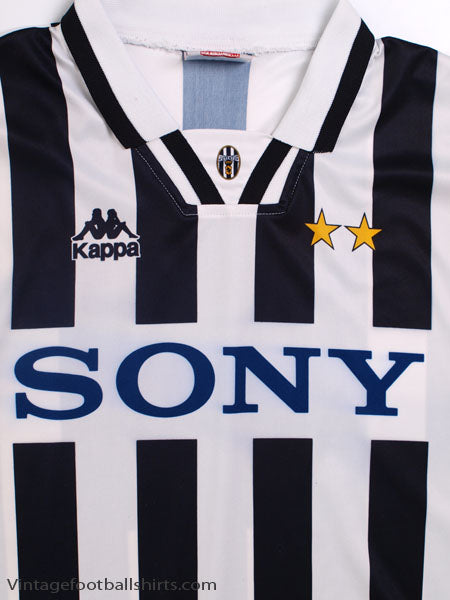 Details - Home shirt as worn when Juventus were attempting to defend their Serie A title from the previous seasonin the 1995-96 season, however, they failed to do so, finishing 2nd in the table, 8 points behind champions AC Milan. They did manage to regain the title in the next season, finishing 2 points clear of second placed Parma. Also worn when Juventus made it to the Champions League final in back to back seasons, beating Ajax on penalties in the 1995-96 season before failing to defend their title in the next season, losing 3-1 against Borussia Dortmund.