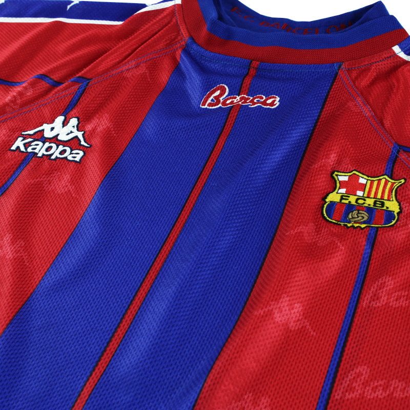 Details - Home shirt as worn when Barcelona won a domestic double under Louis van Gaal, finishing 9 points clear of second placed Athletic Bilbao in La Liga and beating Mallorca 5-4 on penalties in the Copa del Rey final after the tie finished 1-1 after extra time.